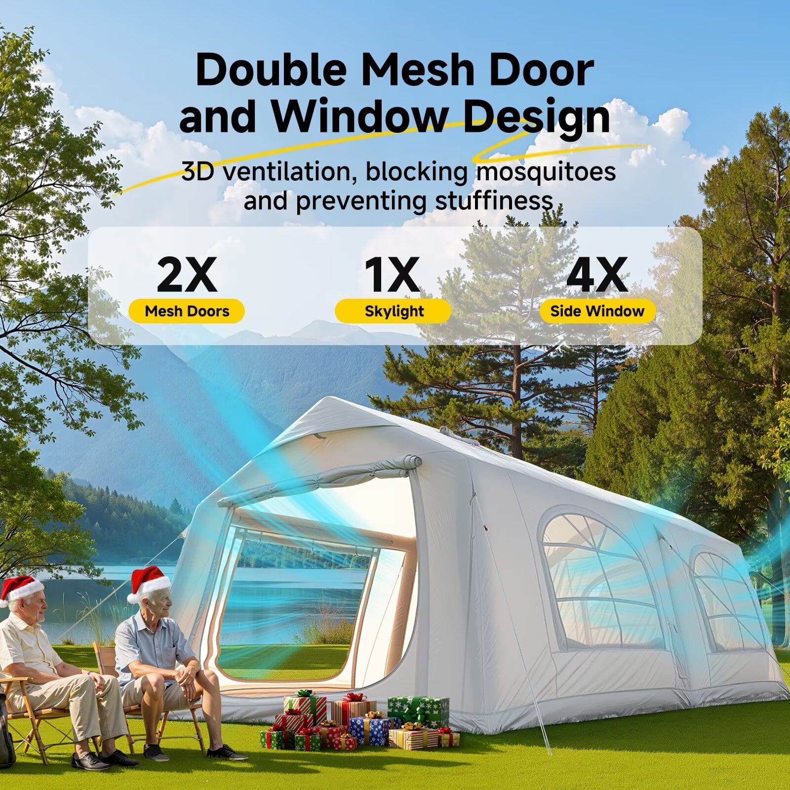 【5min Easy Setup Inflatable Tent】The inflatable camping tent features an Innovative Inflatable beam frame,no need for complex rods; setup and storage are a breeze. It comes with a High-Pressure Fast Inflation Air Pump, and you can have the tent ready in just 5 minutes. Compared to traditional camping tents, it is much simpler to set up and quicker to pack away.