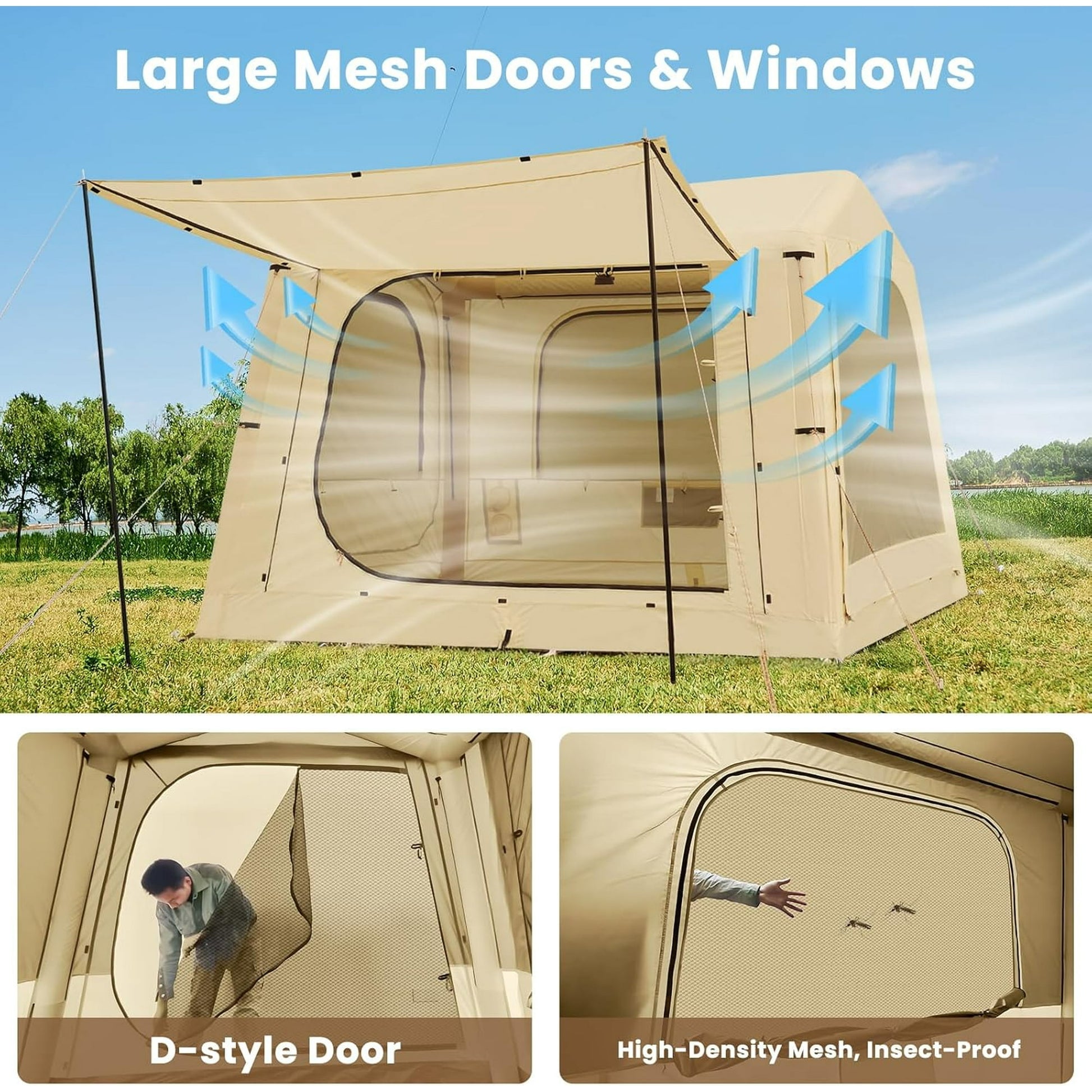 Excellent Ventilation & Weather Protection :Large mesh windows and dual doors ensure bug-free airflow. Made from waterproof PU3000mm polyester, this inflatable camping tent withstands rain, wind, and UV rays.