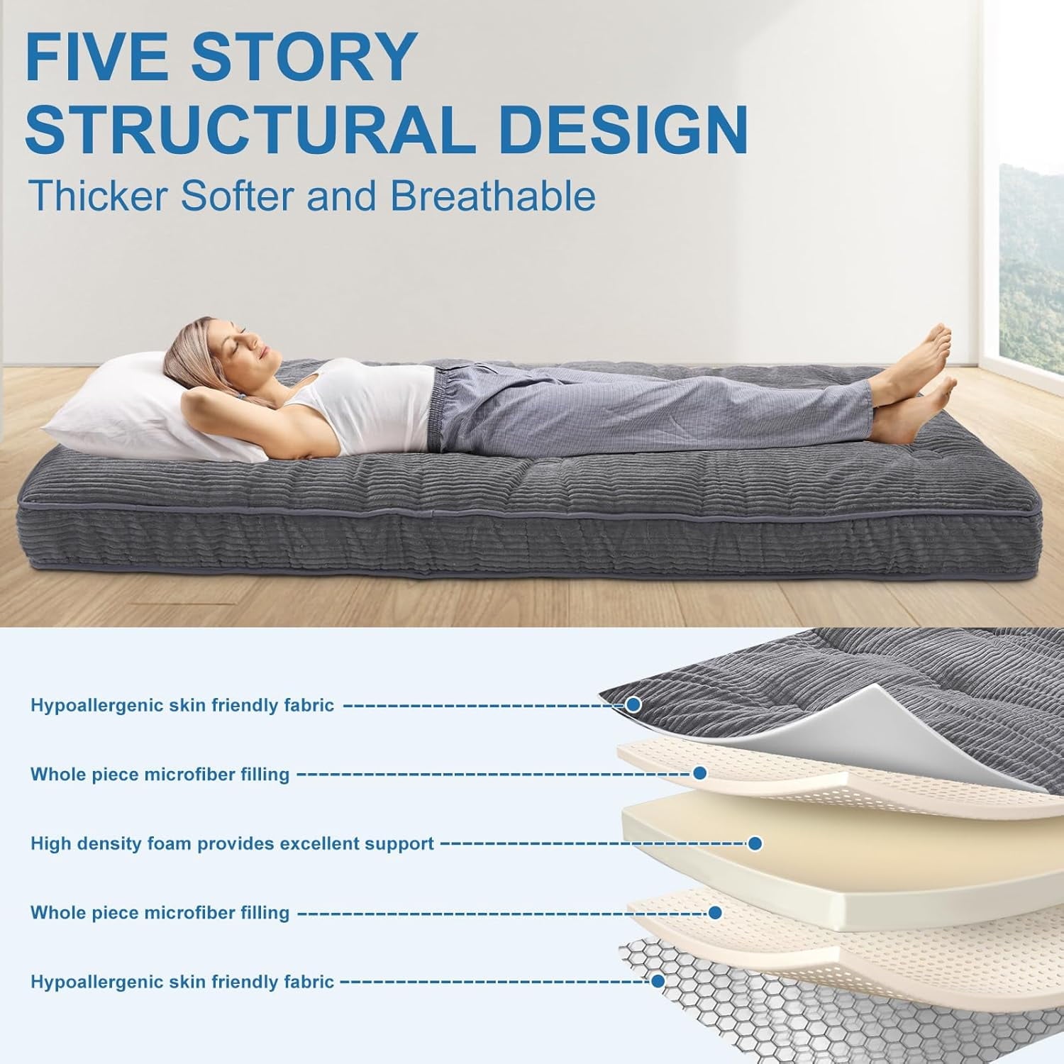 Luxurious Comfort: The futon mattress has a five-layer design. The surface of the floor mattress is a skin-friendly and breathable corduroy fabric. The middle three layers of the mattress are filled with high-quality microfiber and high-density memory foam. The upgraded technology brings better support and comfort.