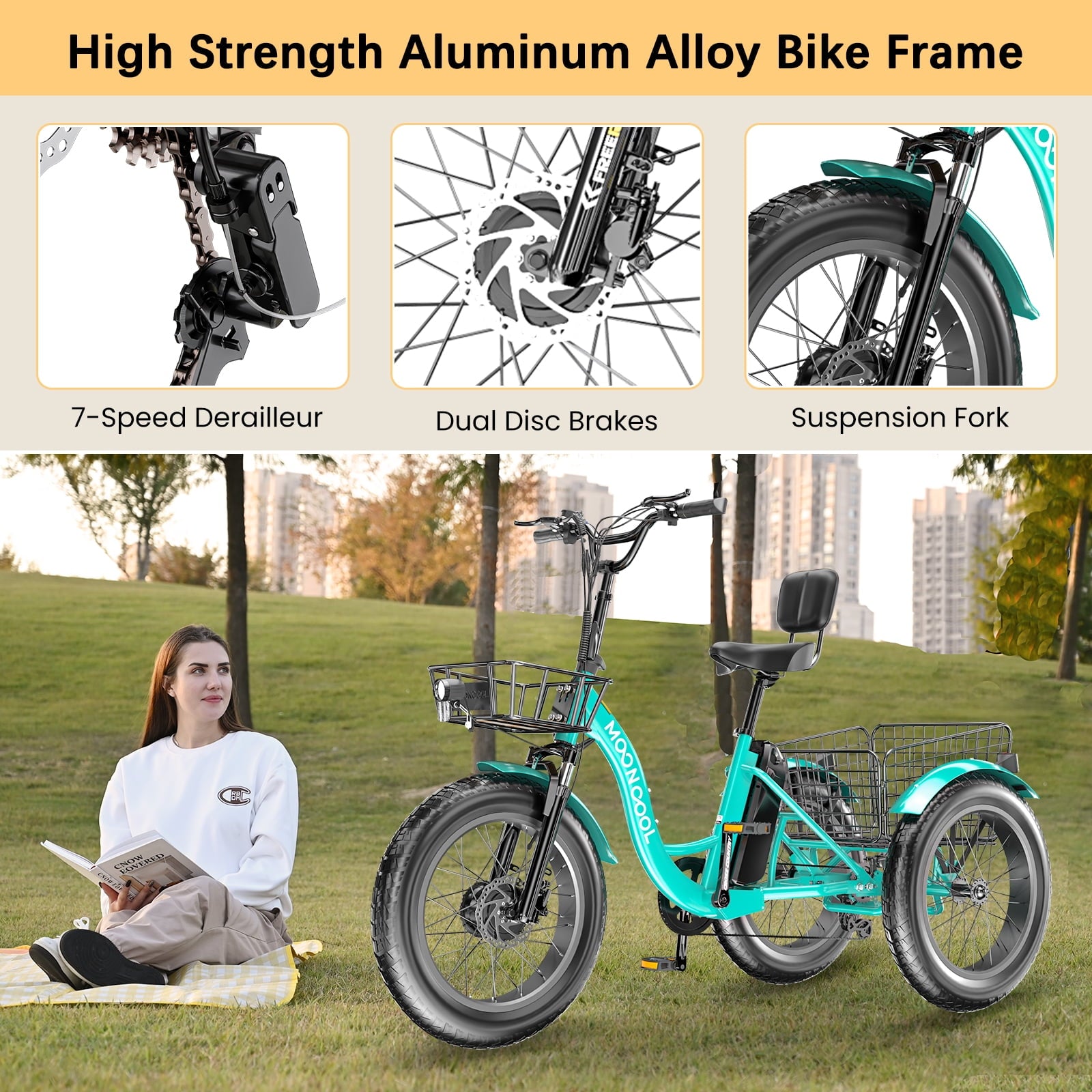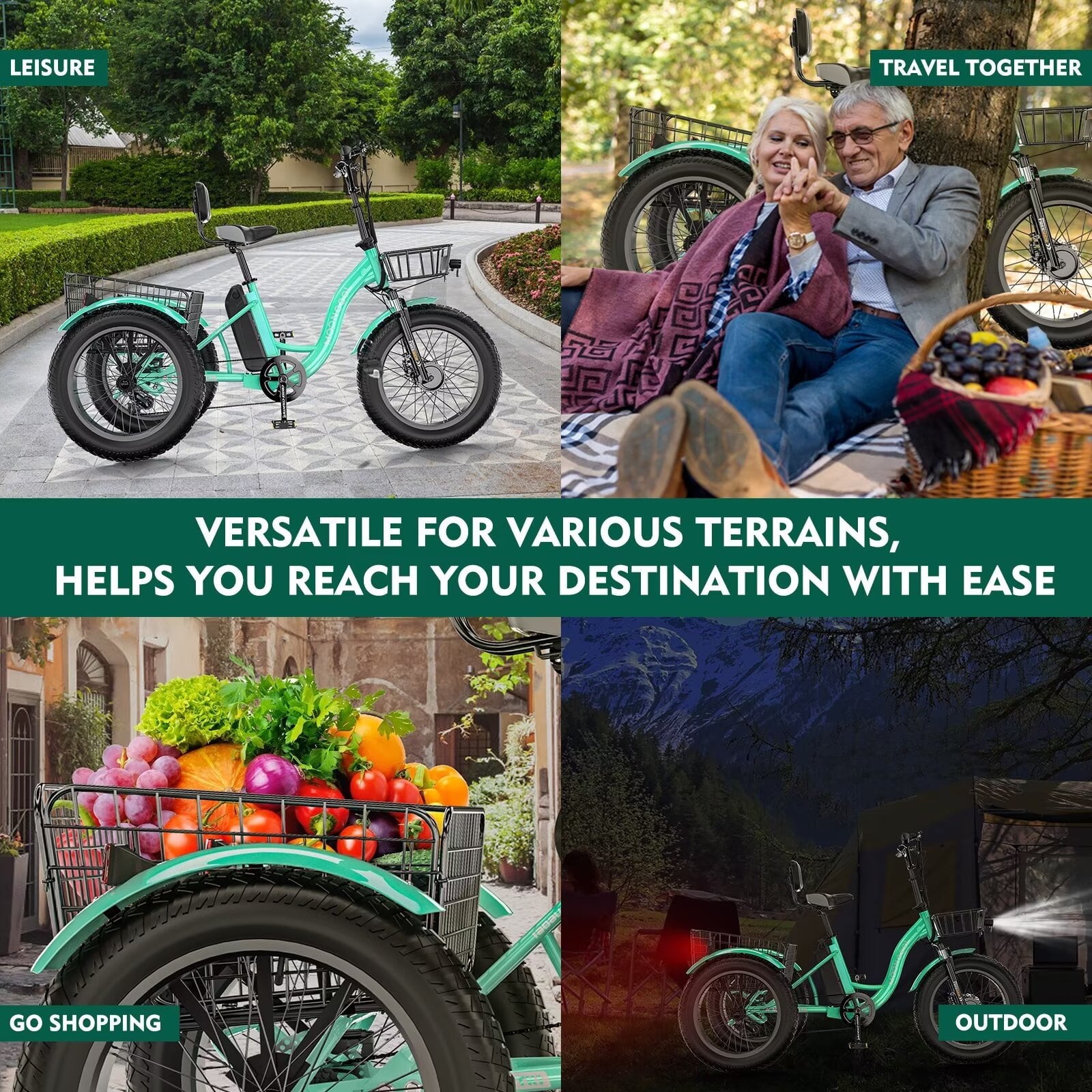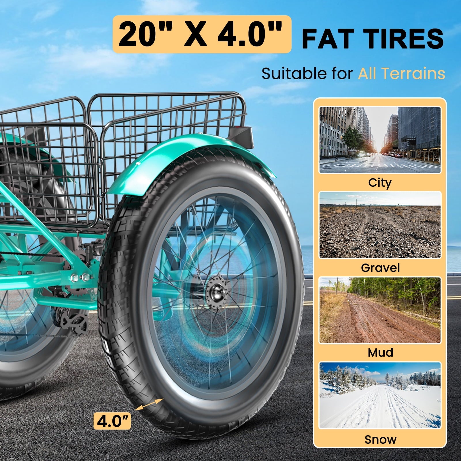 【RIDE WITH SAFE】 Our electric trikes equipped with sturdy 20"x 4" puncture-resistant fat tires, providing excellent grip on any terrain. Adopting 6061 aluminum bike frame, ensuring strength and lifespan, providing a safe experience for your riding.