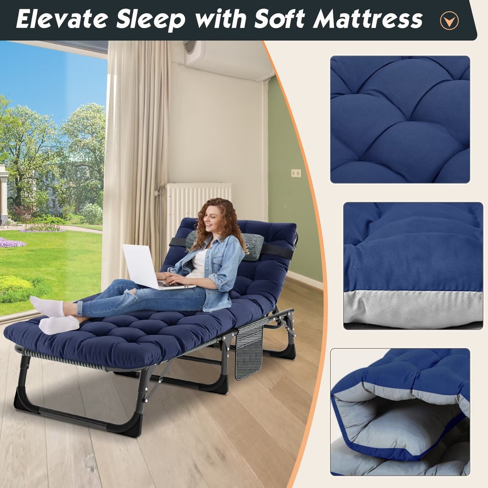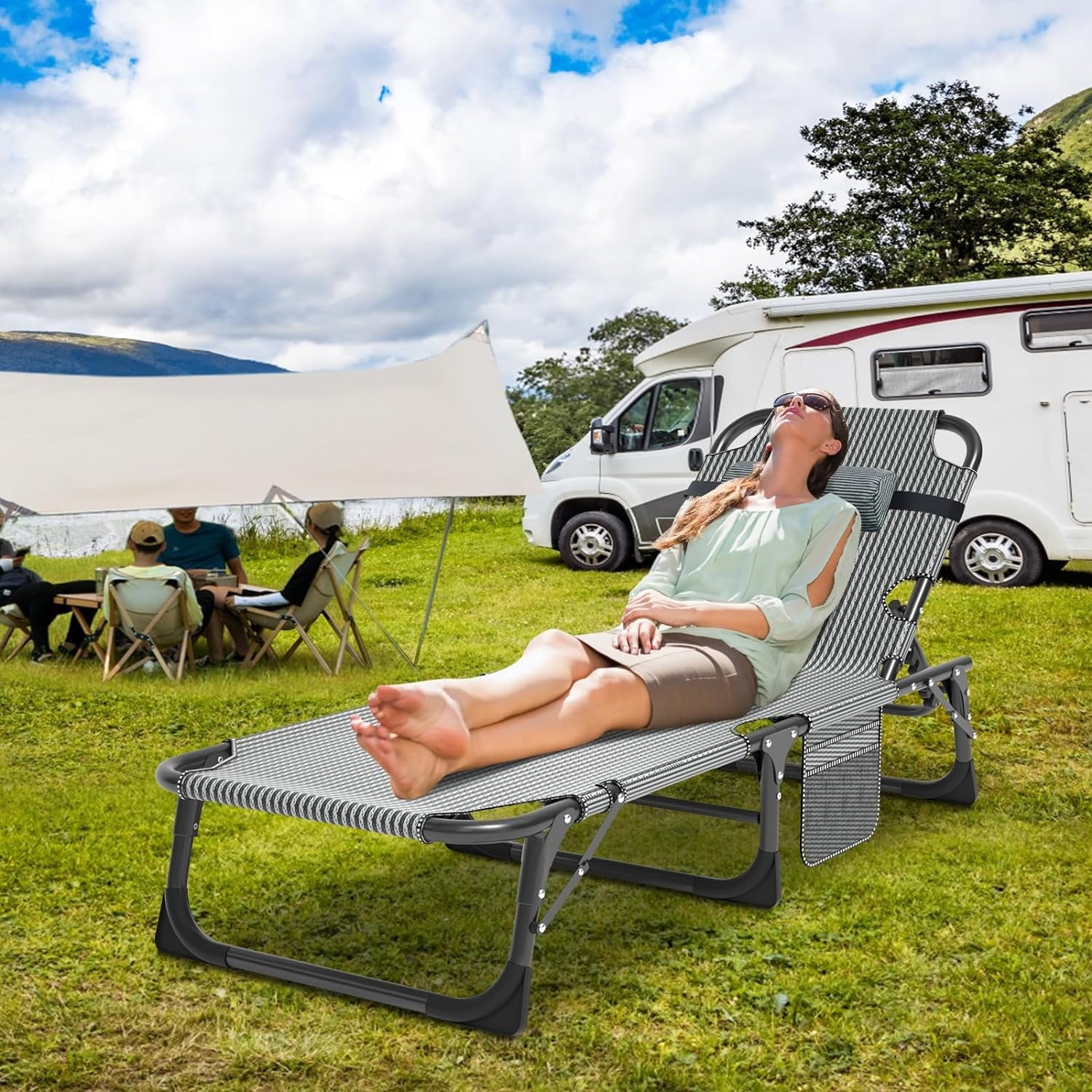 Lilypelle Camping Cot, Adjustable 4-Position Adults Reclining folding Chaise with Pillow, Outdoor portable Lounge Chair Sleeping Cots Bed, Perfect for Camping, Pool, Beach, Patio