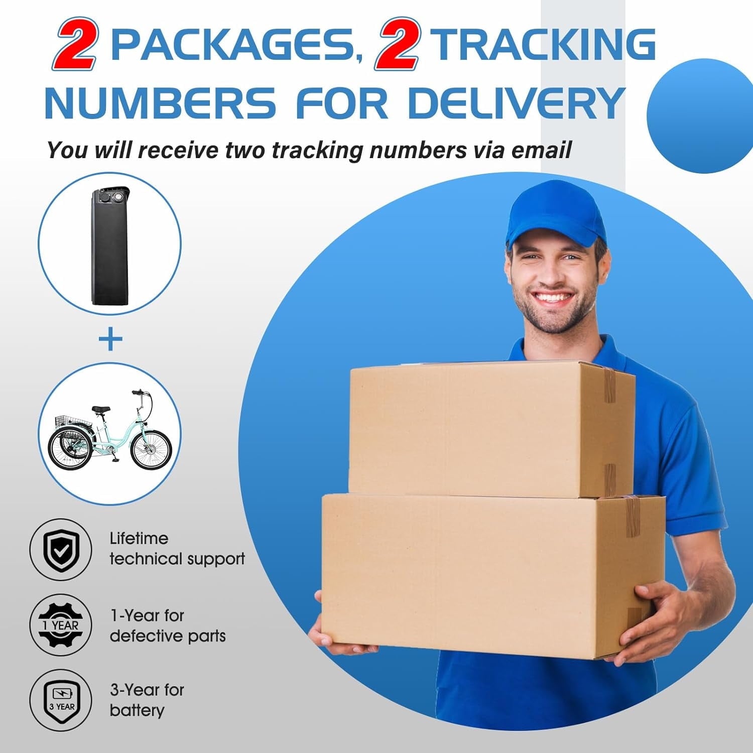 3 Separate Packages: For safety reasons of transportation,the battery and trike and accessories arrive separately. Certified with UL2272 (Report No. WUX202210244422ULR1) and UL2849 (Report No. ZKT-2308236627S)
