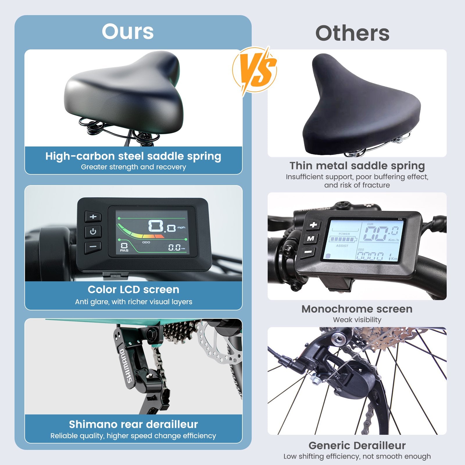 350W Motor and 7-Speed Rear Derailleur: 350W drive motor provides reliable support and 15.5 mph top speed. Comes with a removable 36V/10.4AH battery covering a range of 30 miles per full charge.We also offer 14.5ah lithium batteries for your choice.