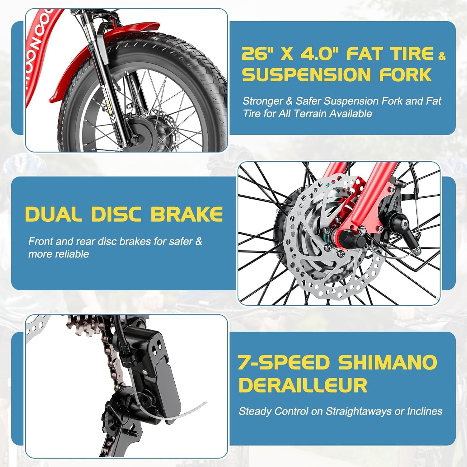 7-Speed Gear System :Our 500w rear-drive motor delivers dependable support and reaches a top speed of 15.5 mph. Featuring a 7-speed rear derailleur, double rim, and disc brake options, you'll enjoy precise stopping power and steady speed control on downhill rides. Plus, the upgraded double rim offers enhanced stability for a smoother ride