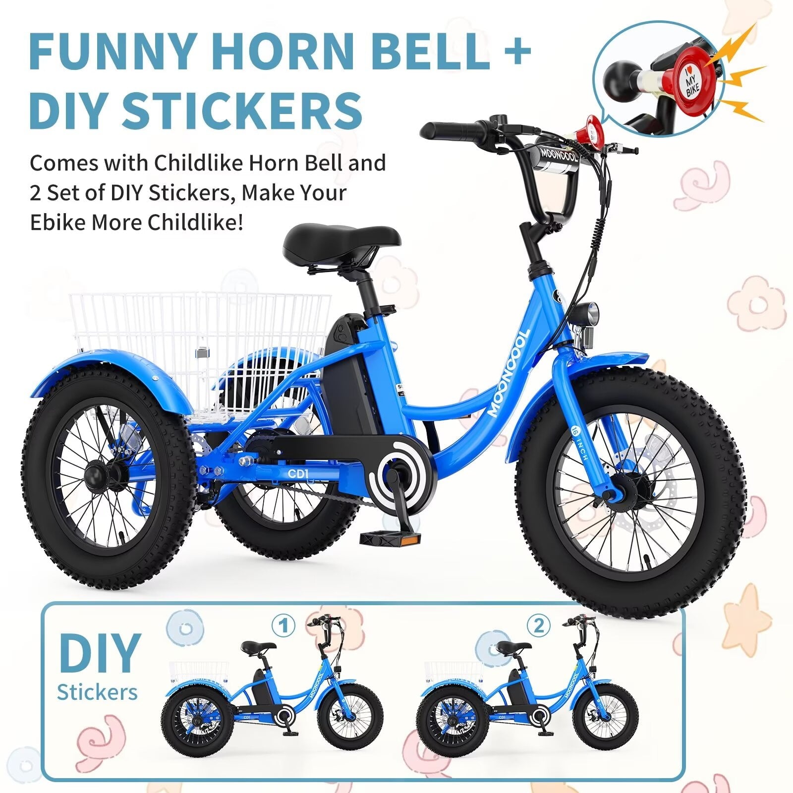 Lilypelle Electric tricycle for Kids , 6/9/12Mph three wheel electric bike w/ 250W motor,24V 10.4Ah Battery, Headlights & Horn, Large Rear Basket ,2 sets of DIY stickers,16"x3" Wheel,30Miles