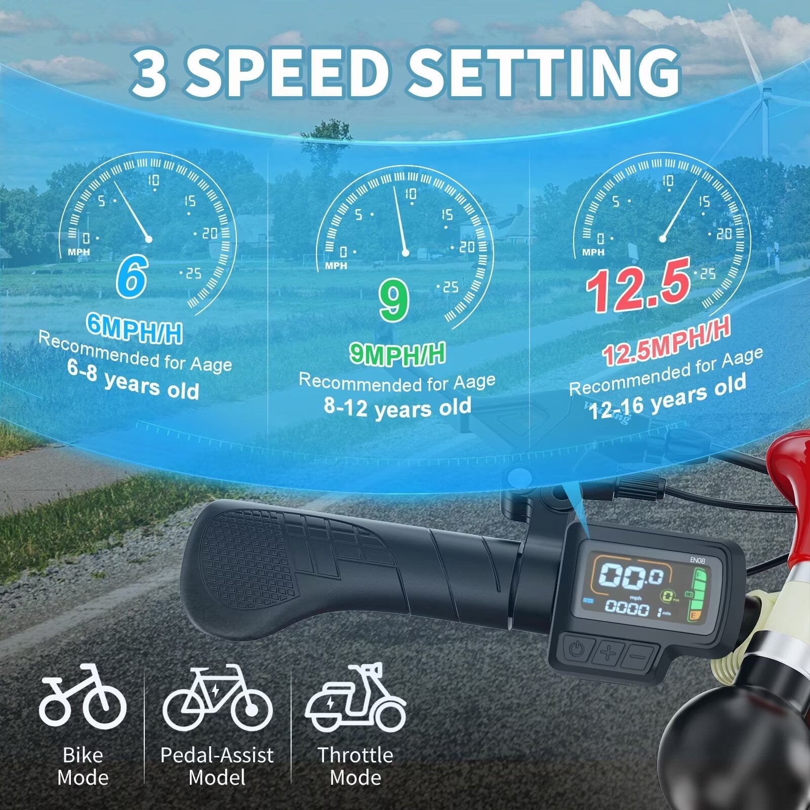 ELECTRIC TRICYCLE FEATURES :Equipped with a robust electric system tailored for children, it offers three speed settings (6/9/12.5 mph) to cater to various age groups. An intuitive LCD screen simplifies operation