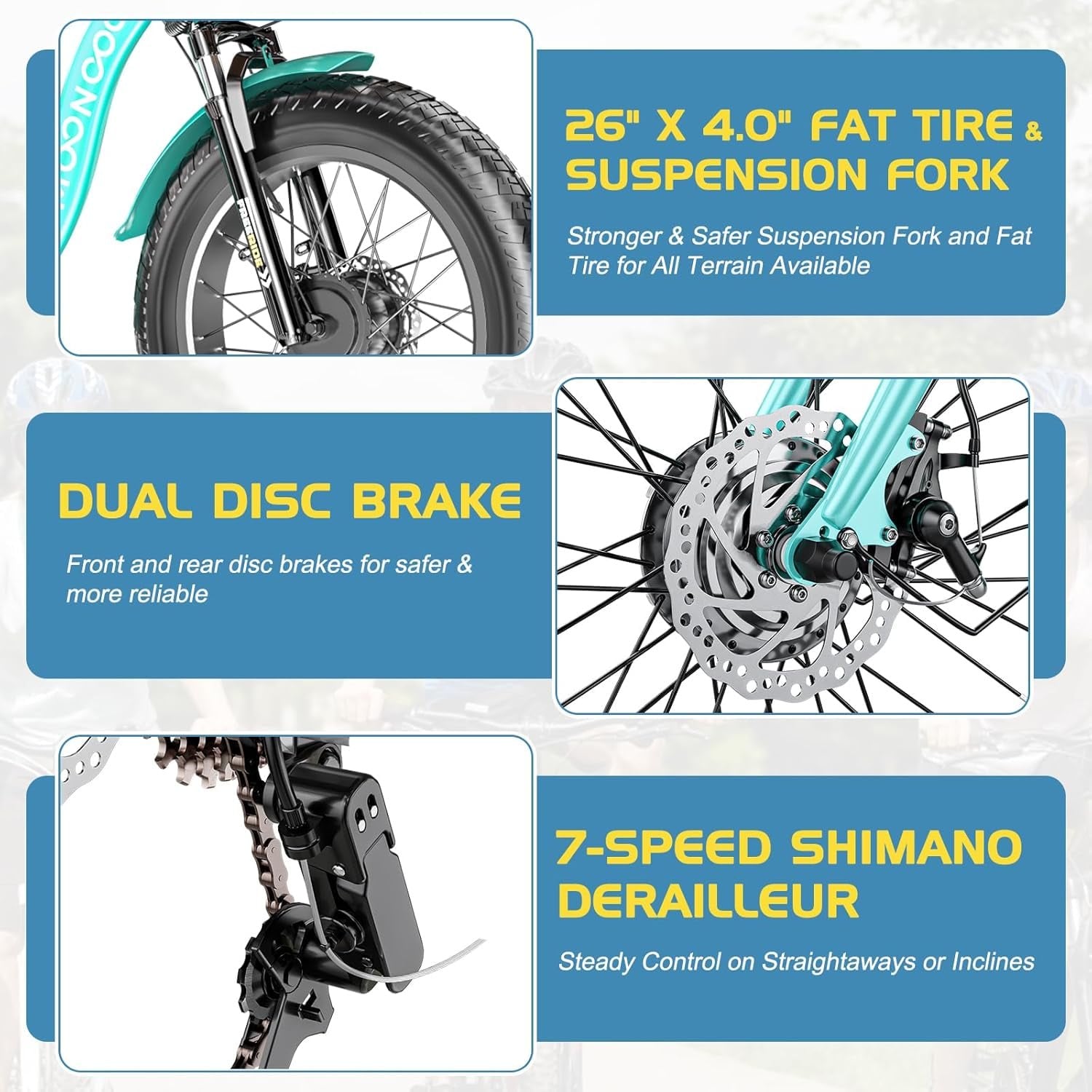 7-Speed Gear System :Our 500w rear-drive motor delivers dependable support and reaches a top speed of 15.5 mph. Featuring a 7-speed rear derailleur, double rim, and disc brake options, you'll enjoy precise stopping power and steady speed control on downhill rides. Plus, the upgraded double rim offers enhanced stability for a smoother ride