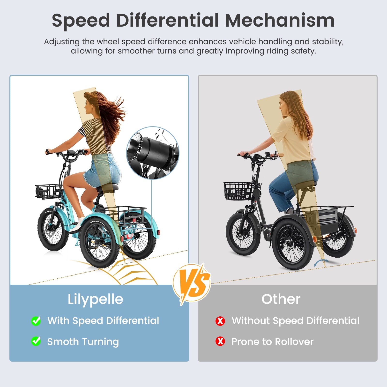 Powerful Motor and Rear Speed Differential: The electric trike is equipped with a 48V 500W helical motor with a peak power of 750W and a peak torque of 43NM.. Not only enhances your speed and torque but also eliminates any concerns of startup slippage, guaranteeing a smooth riding experience