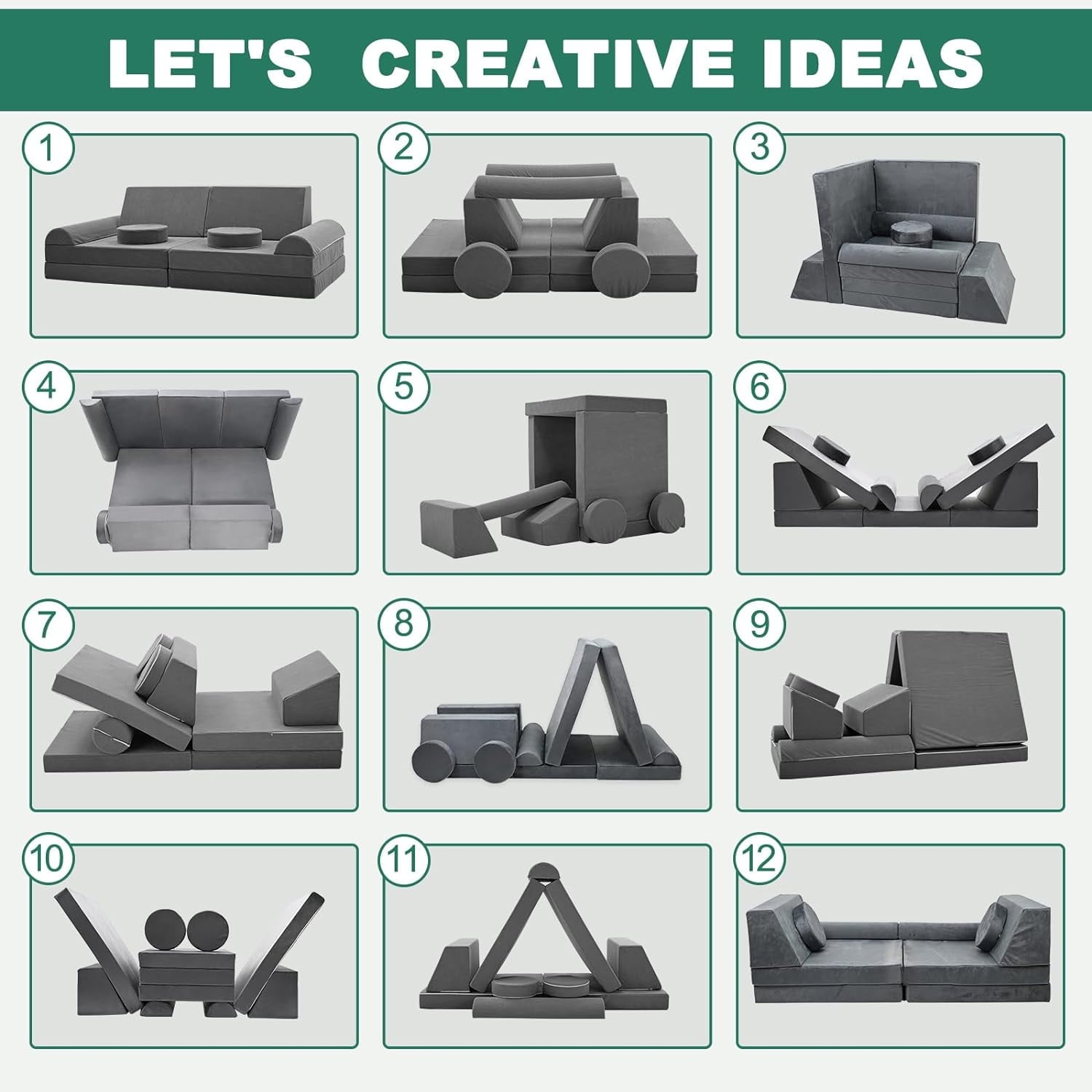 Your children deserve the best! Unleash the creativity of your kids with the Lilypelle Modular Kids Play Couch. It consists of 2 circular seat cushions, 2 semi circular armrests,2 ladder shaped backrests, and 4 square bases.These 10 foam pieces can become a car, a tent, a church, a scooter, a castle, a slide, a sofa, a bed lounge, or anything that your children can imagine.It offers endless possibilities to stimulate creativity, Imagination, motor skills and logical capability.Additionally, features machine-washable fabric and smooth zippe.