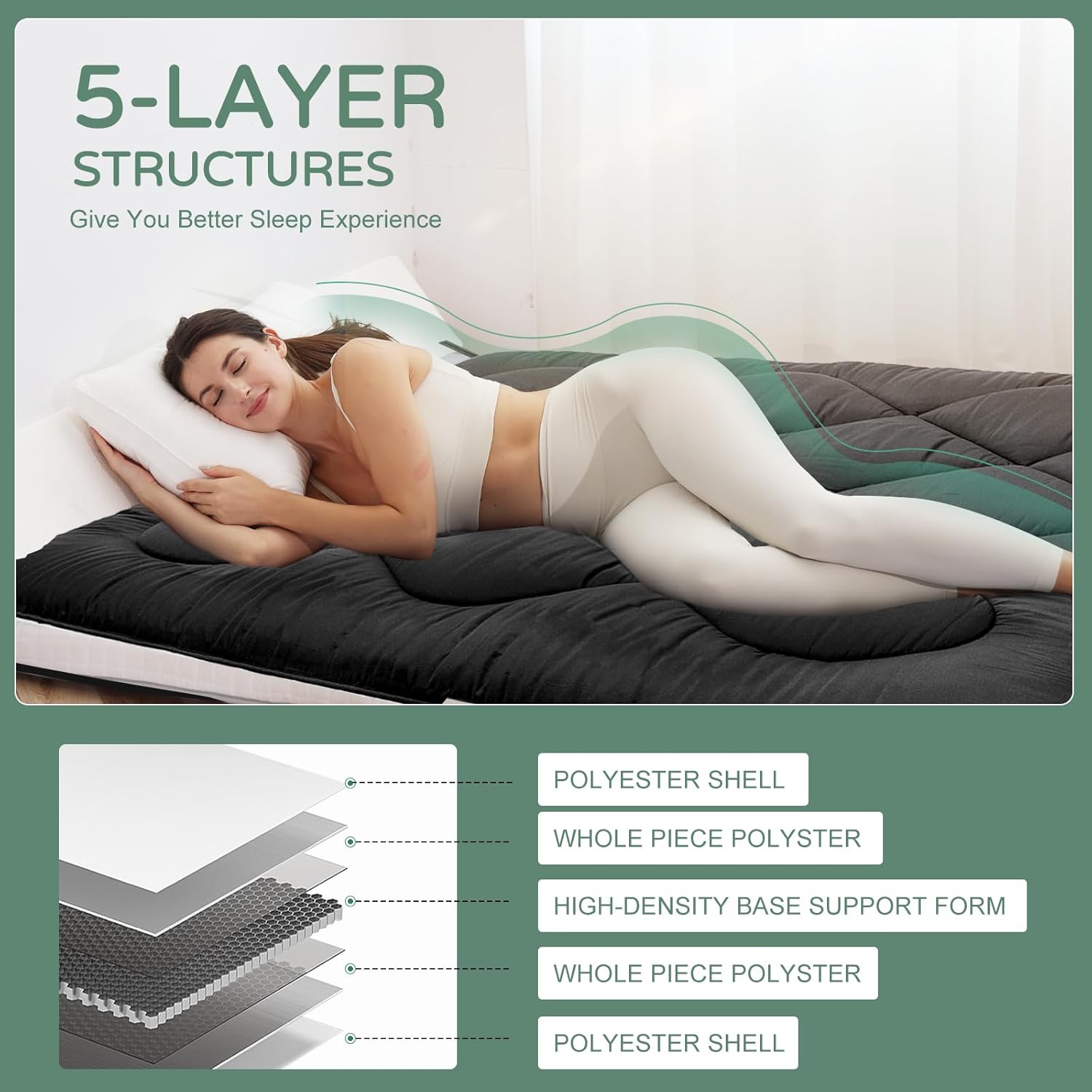 - [PREMIUM MATERIAL] Our Japanese Floor Mattress has a five-layer design that is skin-friendly, comfortable, and breathable. The combination of memory foam and additional padding filled in the mattress is not only soft, but also provides good support for your body, relieving your stress and making you extremely relaxed and comfortable;