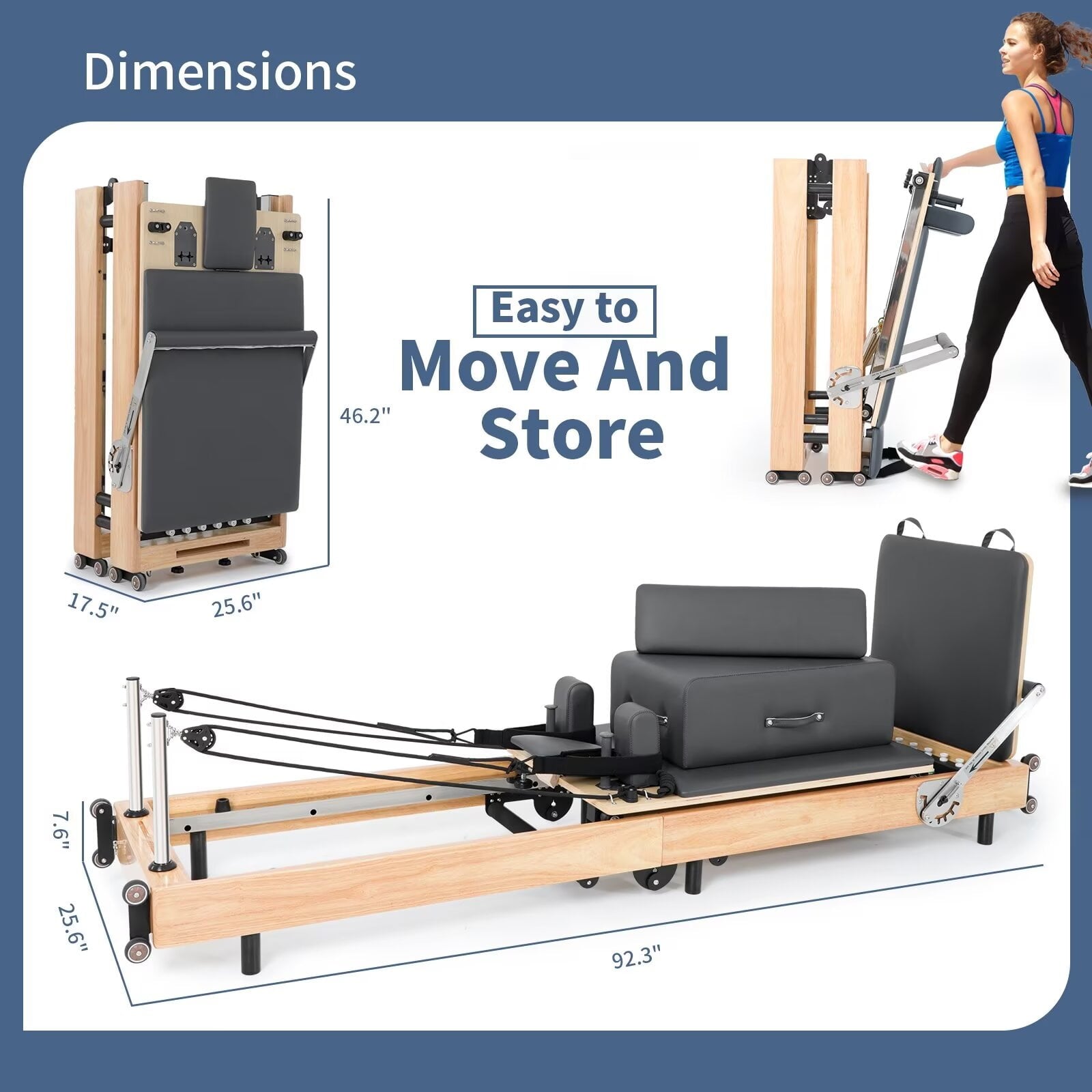 Lilypelle multifunctional pilates reformer machine is very suitable for people who enjoy exercising at home, it can help you lose weight, enhance balance, strengthen muscle groups, improve endurance, beautify posture, and engage in flexibility training. Its framework is made of solid oak board, with excellent oxidation resistance and a maximum load-bearing capacity of 500lbs. Equipped with 6 springs, the force can be adjusted according to training needs. The folded size is 25.6 "(L) * 17.5"(w)*46.2"(H), which can be easily stored under the bed or in other corners. At the same time, it is also equipped with 8 rollers, which allows even one person to easily move it after folding.It enjoys a one-year free warranty, so you can order and use it with confidence.