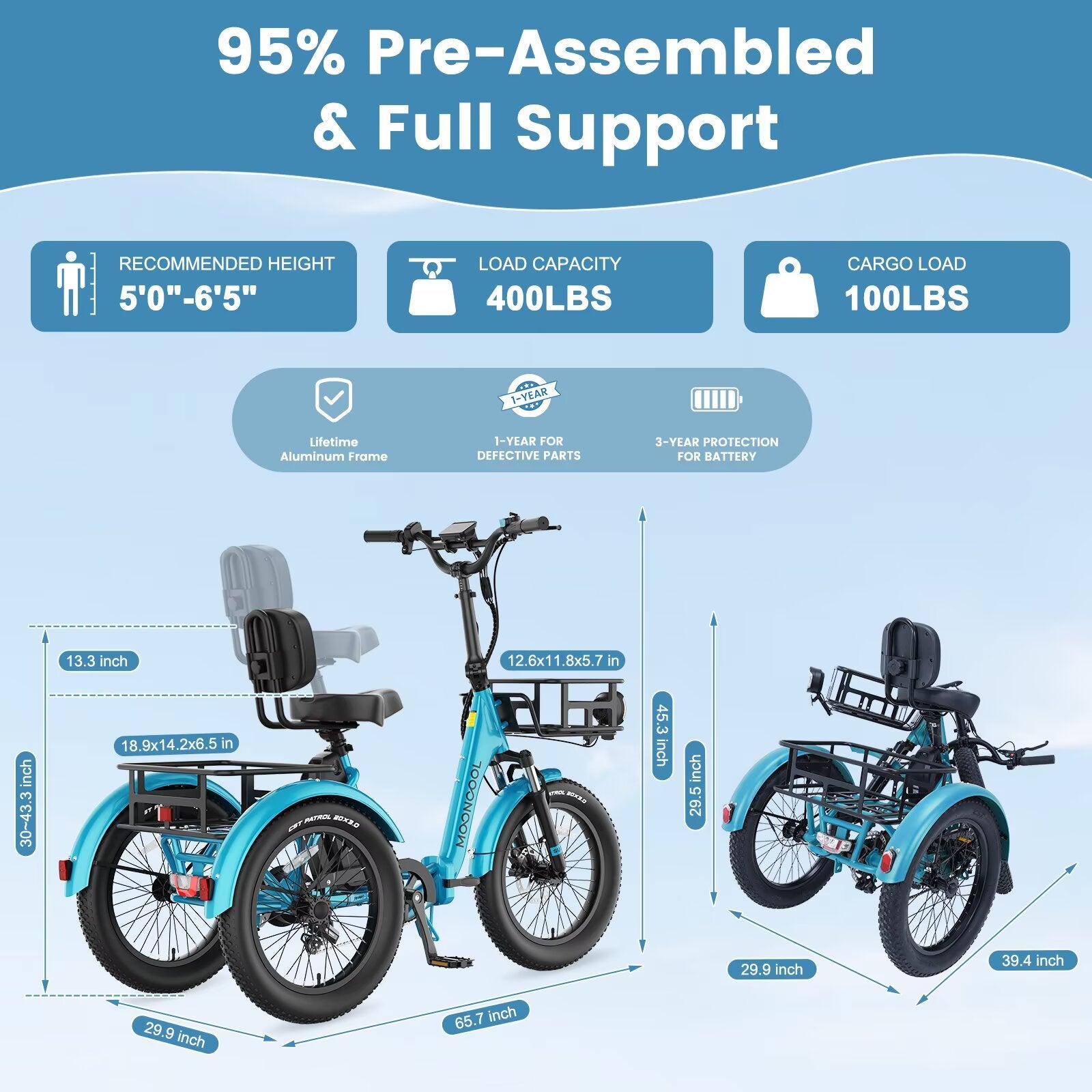 Rear Drive Motor:Equipped with a 750W rear drive motor,Lilypelle TK-Pro adult electric tricycle can reach up to 1500W peak power and a 450 lbs load capacity, it offers more powerful and reliable performance to tackle various terrains and travel needs.